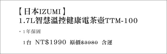 | 日本IZUMI-1.7L智慧溫控健康電茶壺(TTM-100)-採用#304不鏽鋼濾網,智慧溫控調節保溫,具分離斷電、防空燒等裝置,任何時刻都能悠享品茶愜意只要1990元(含運)即可購得【日本IZUMI 售價:1990 我要購買 |
